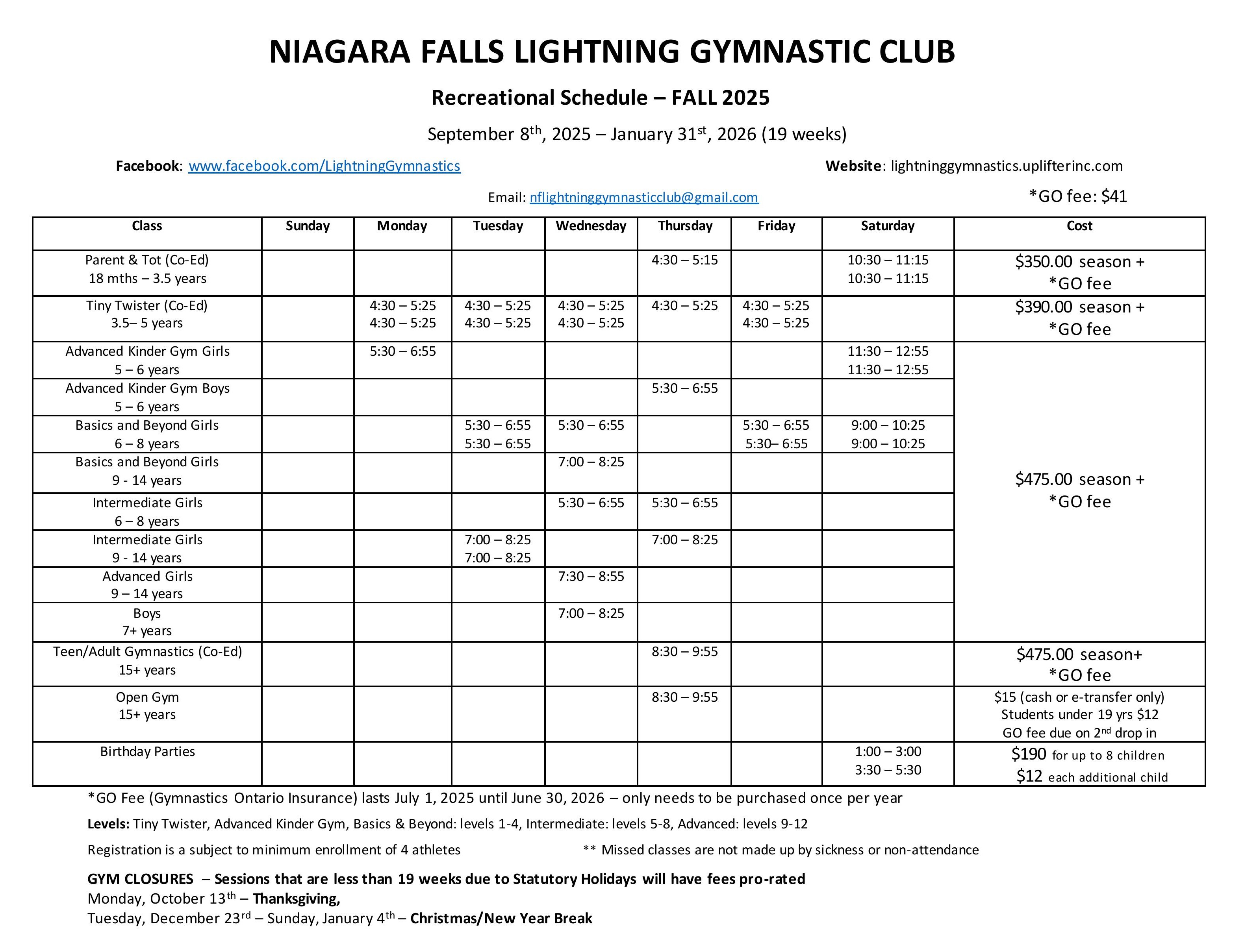 2026 Winter Recreational Schedule released! Winter / Spring session runs from February 2nd until June 29th.