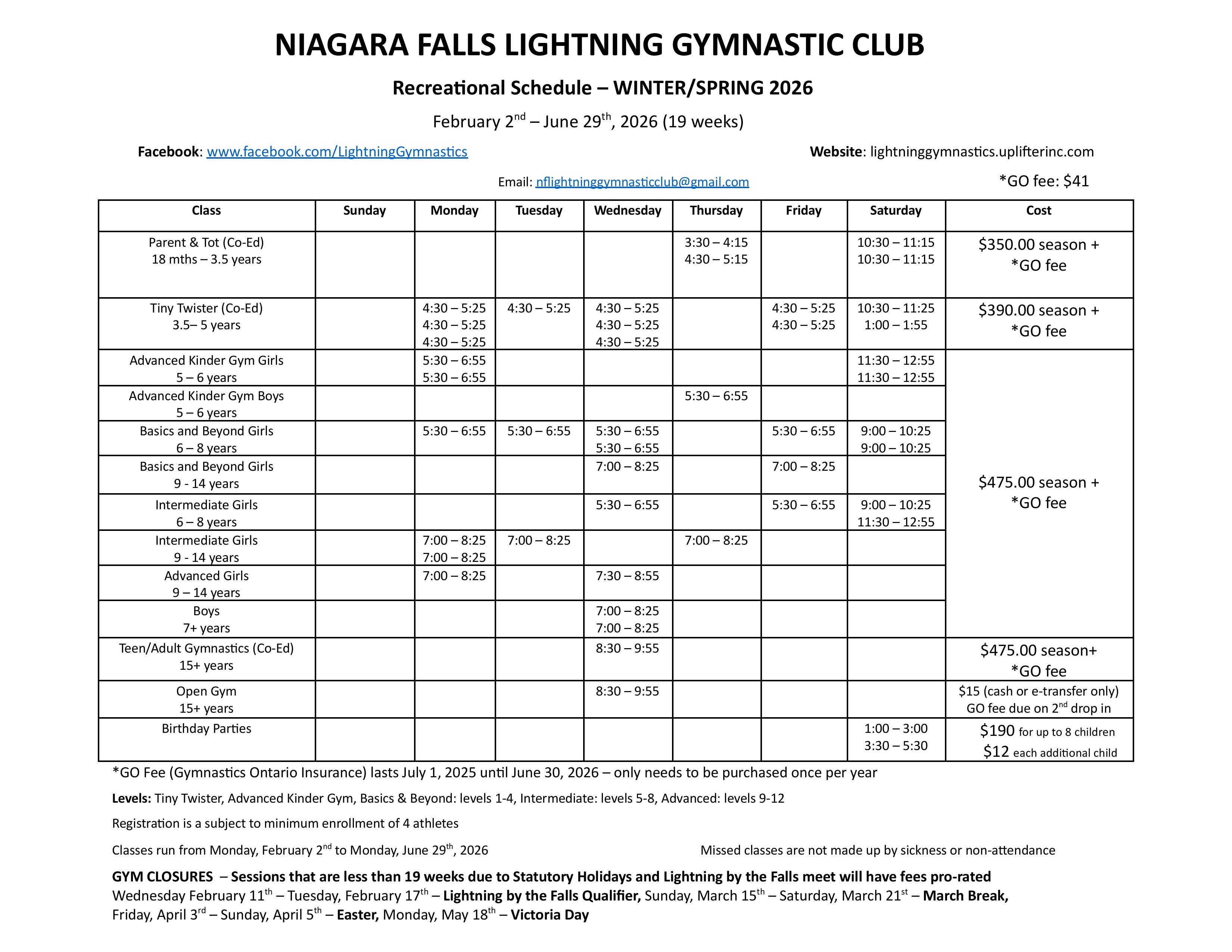 2026 Winter Recreational Schedule released! Winter / Spring session runs from February 2nd until June 29th.